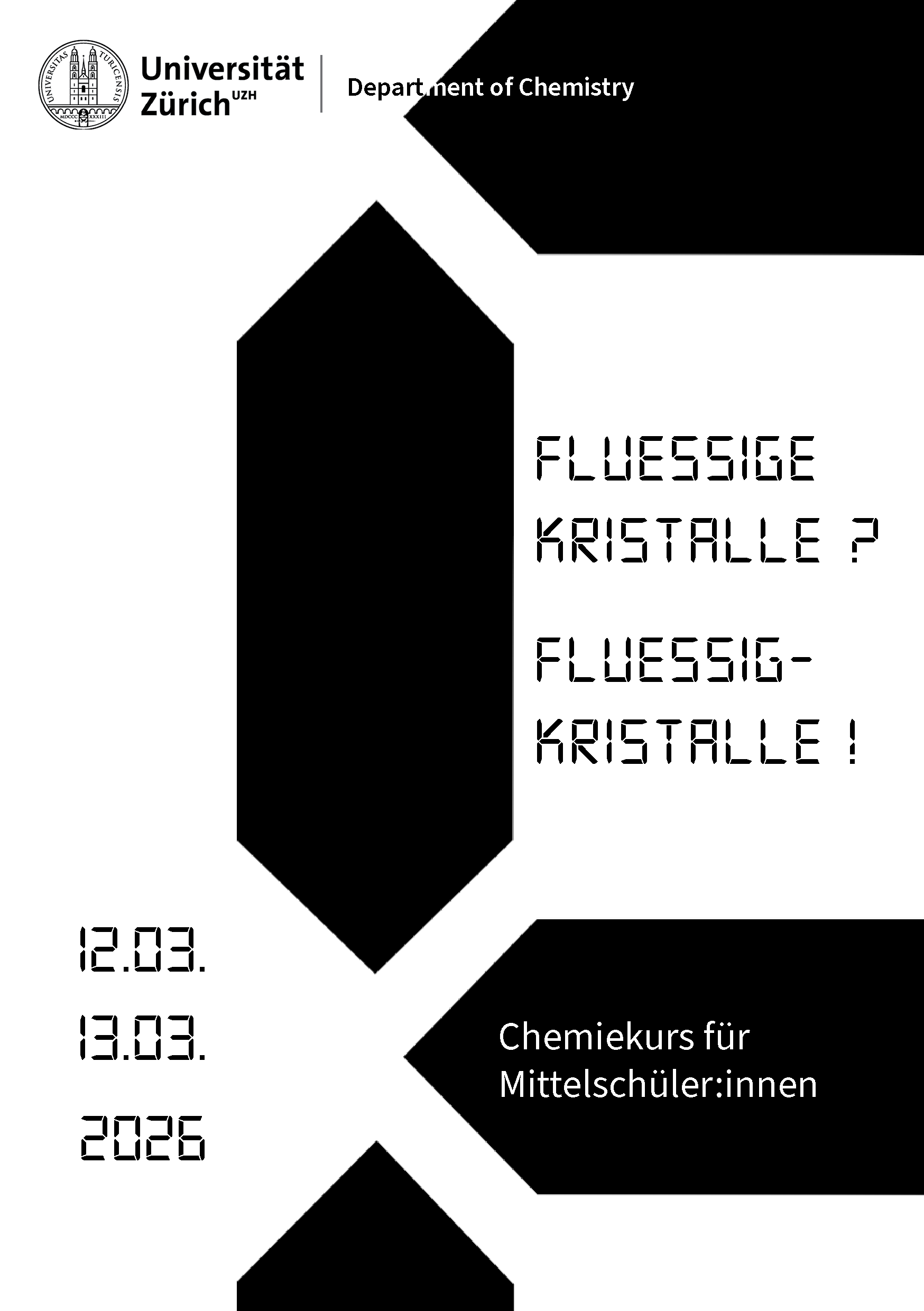 Fünf Chemielehrer bieten zusammen mit Forschenden des Instituts für Chemie der Universität Zürich einen ganztägigen Chemiekurs für Mittelschülerinnen und Mittelschüler an. Der Weiterbildungstag beinhaltet Theorie, Experimente und Demonstrationen zu Flüssigkristallen und Flüssigkristallanzeigen.